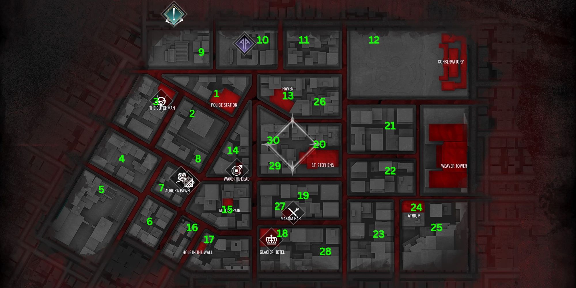 11 | Высоко на здании вдоль северной границы карты. Квартал находится между вашей Haven и Консерваторией. |
