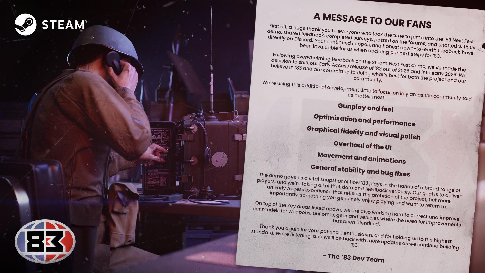 После получения отзывов о недавней демоверсии Steam Next Fest, Blue Dot Games перенесла дату выхода в ранний доступ ’83 на начало 2026 года. Ранее планировалось выпустить игру до конца 2025 года.